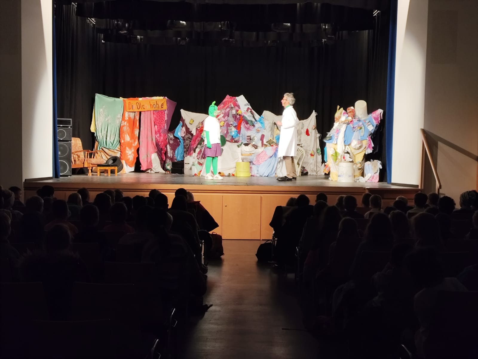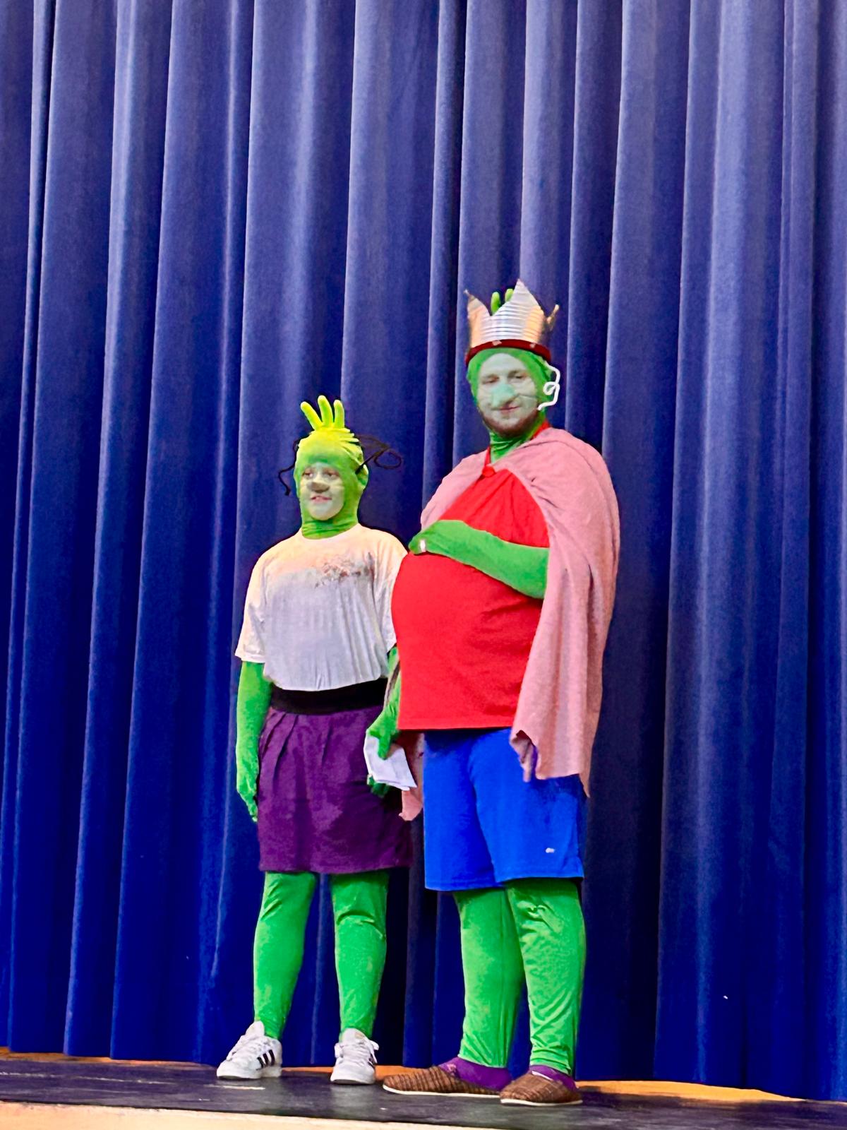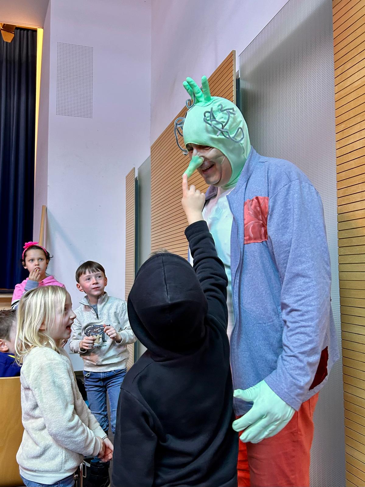 Die ersten Klassen erlebten einen aufregenden Vormittag im Theater in Rosenheim bei den Olchis. Schon beim Betreten des Theaters war die Aufregung groß. Auf der Bühne wurde es dann richtig spannend: Die Olchis bekamen Besuch von einem faulen König, der sie ständig herumkommandierte und großspurig behauptete, dass er fliegen könne.